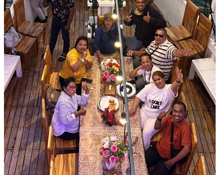 Makassar, Wartamaluku.com – Puluhan Jurnalis mitra Bank Indonesia (BI) Provinsi Maluku menikmati keindahan wisata bahari kapal Phinisi di Pantai Losari, Kota Makassar, Sulawesi Selatan, dalam acara makan malam bersama yang berlangsung penuh keakraban, kamis, 09/10/2025.