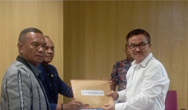 Kedatangan Jufri bersama tim di kantor DPRD Maluku, Jumat (24/11/2023) pukul 15.09 WIT, disambut Panitia Kerja (Panja) DPRD, Mumin Refra dan Anos Yermias.